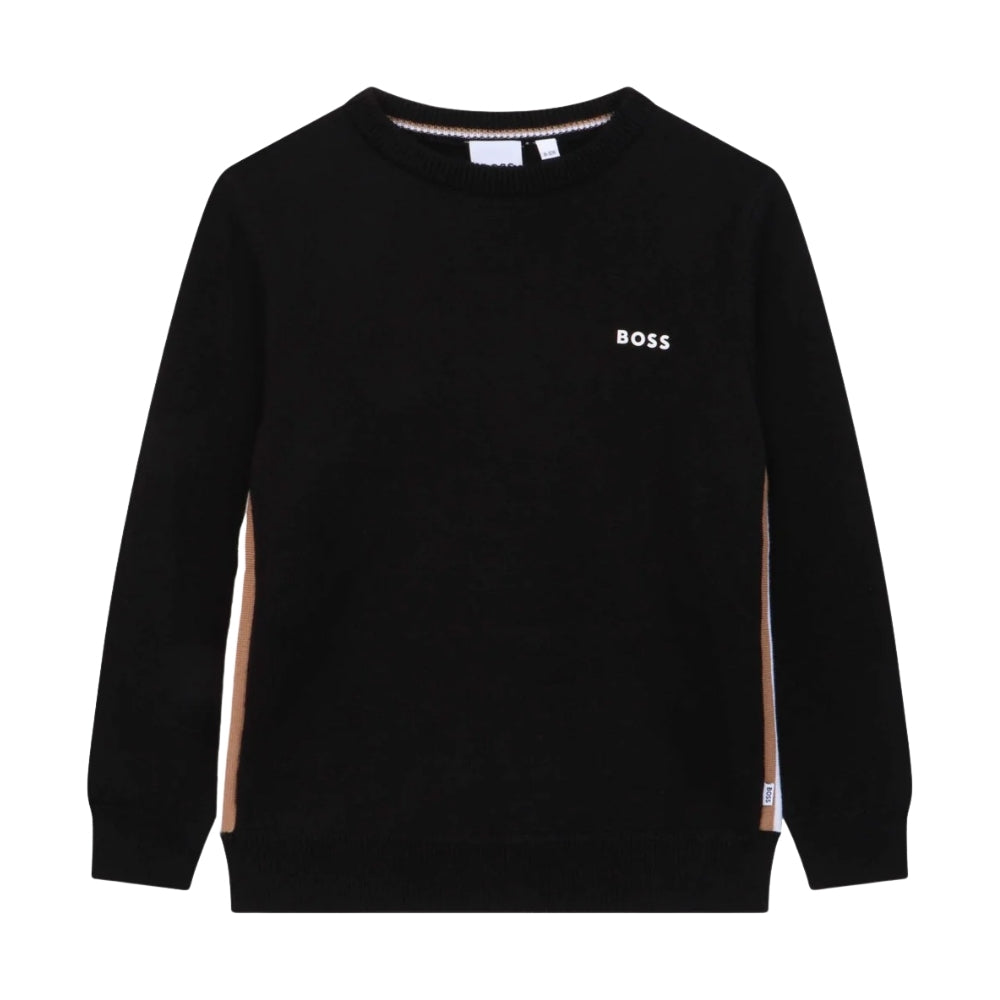 Este suéter de BOSS ofrece un estilo moderno y sofisticado ideal para los días frescos. Confeccionado en suave mezcla de algodón, brinda calidez y comodidad sin sacrificar elegancia. Su diseño en color negro incluye el logotipo BOSS bordado en el pecho y franjas laterales en tonos contrastantes que le dan un toque distintivo. Perfecto para combinar con jeans o pantalones chinos, este suéter es una prenda versátil que aporta clase al look diario de los más pequeños.