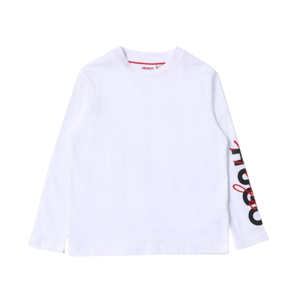 Camiseta blanca de manga larga HUGO Boss, confeccionada en algodón suave y transpirable. Presenta un diseño moderno con el distintivo logo HUGO estampado en la manga, aportando un toque de estilo urbano y elegante. Ideal para un look casual o para combinar con prendas más formales.