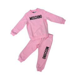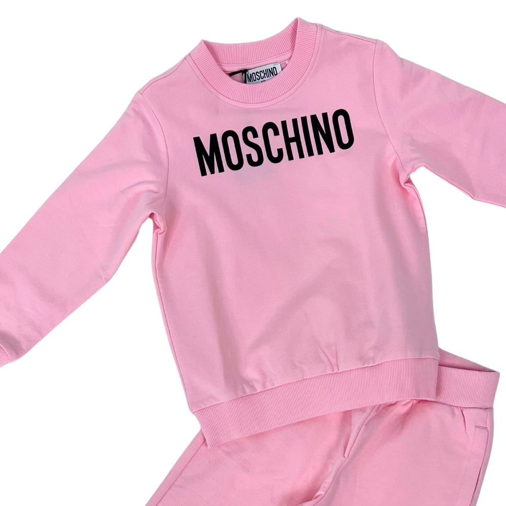 Conjunto de Moschino, compuesto por sudadera y pantalón jogger en color rosa suave. Fabricado en algodón de alta calidad, garantiza comodidad y estilo en cada uso. La sudadera presenta cuello redondo, puños y dobladillo acanalados, mientras que el jogger incluye cintura elástica y bolsillos laterales. El diseño destaca por el logotipo Moschino en color negro estampado en ambas piezas, logrando un look moderno, casual y versátil.