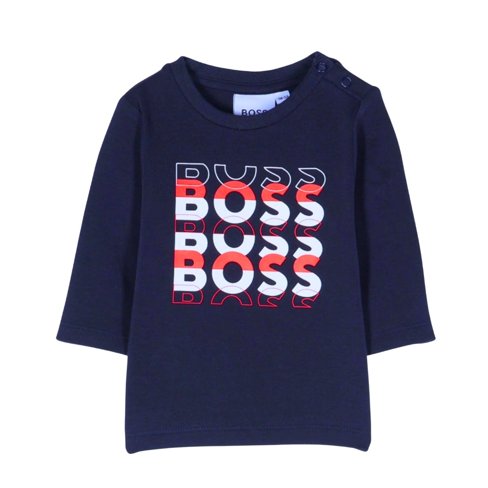 Esta playera de manga larga de BOSS para bebé ofrece un look moderno y divertido, sin perder el toque elegante característico de la marca. Confeccionada en suave algodón orgánico, garantiza comodidad y transpirabilidad durante todo el día. Su diseño destaca por el logotipo BOSS repetido en tonos rojo, blanco y azul, aportando un estilo dinámico y llamativo. Incluye botones a presión en el hombro para facilitar el cambio de ropa.