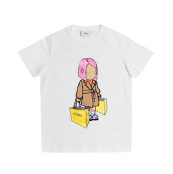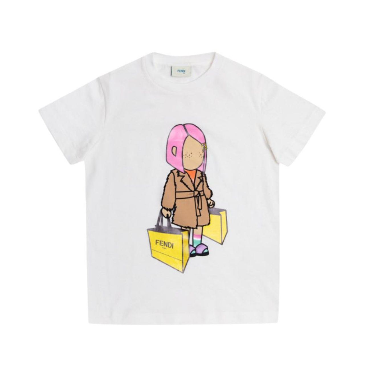 De estilo artístico y moderno, esta camiseta blanca se distingue por un gráfico tipo caricatura de una chica con cabello rosa y abrigo marrón, cargando bolsas amarillas de Fendi. Una pieza divertida y urbana que rompe con lo clásico y apuesta por la originalidad.