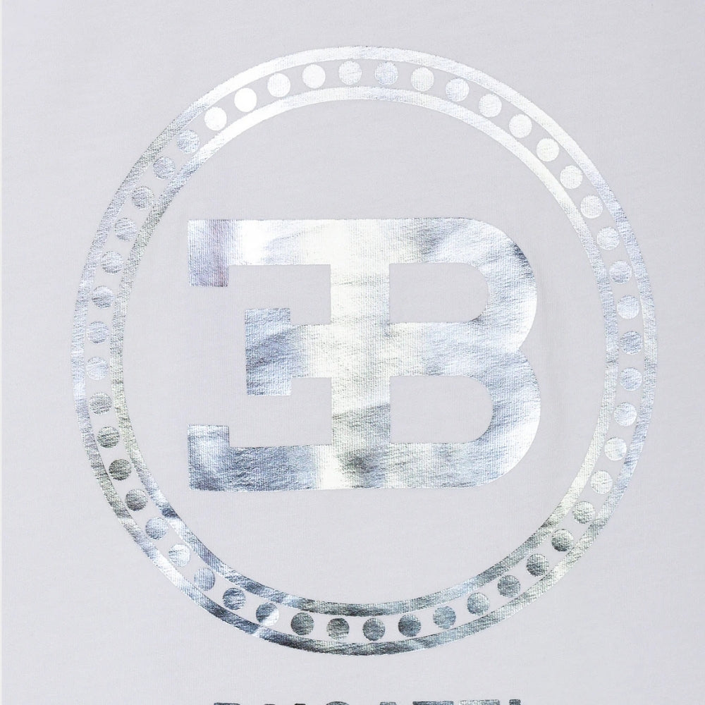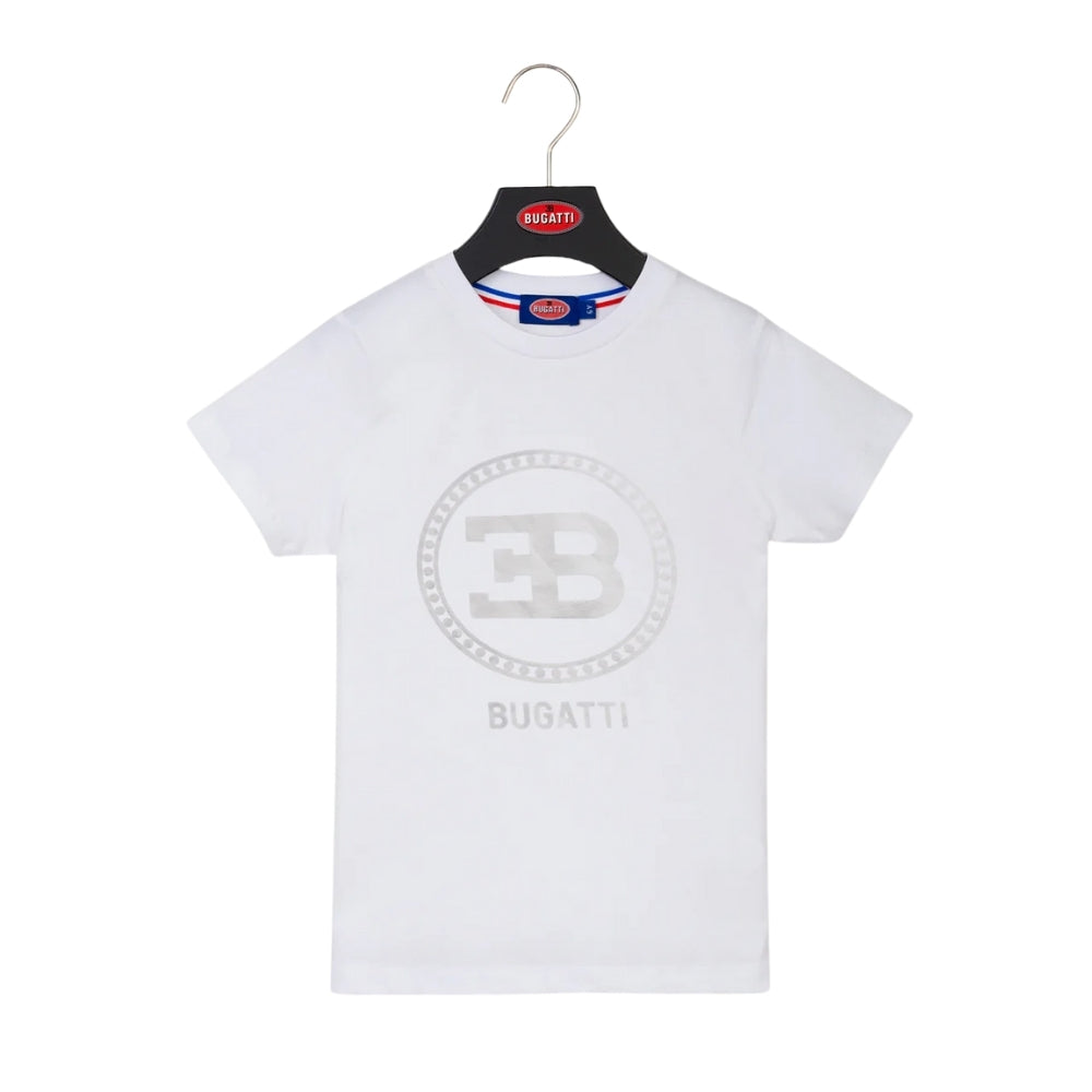 Playera de manga corta en color blanco, confeccionada en algodón suave y transpirable. Presenta en el frente el distintivo logotipo EB en acabado metálico plateado, rodeado de un diseño circular con detalles punteados, y el nombre Bugatti en la parte inferior. Una prenda elegante y minimalista que combina a la perfección estilo deportivo y sofisticación.