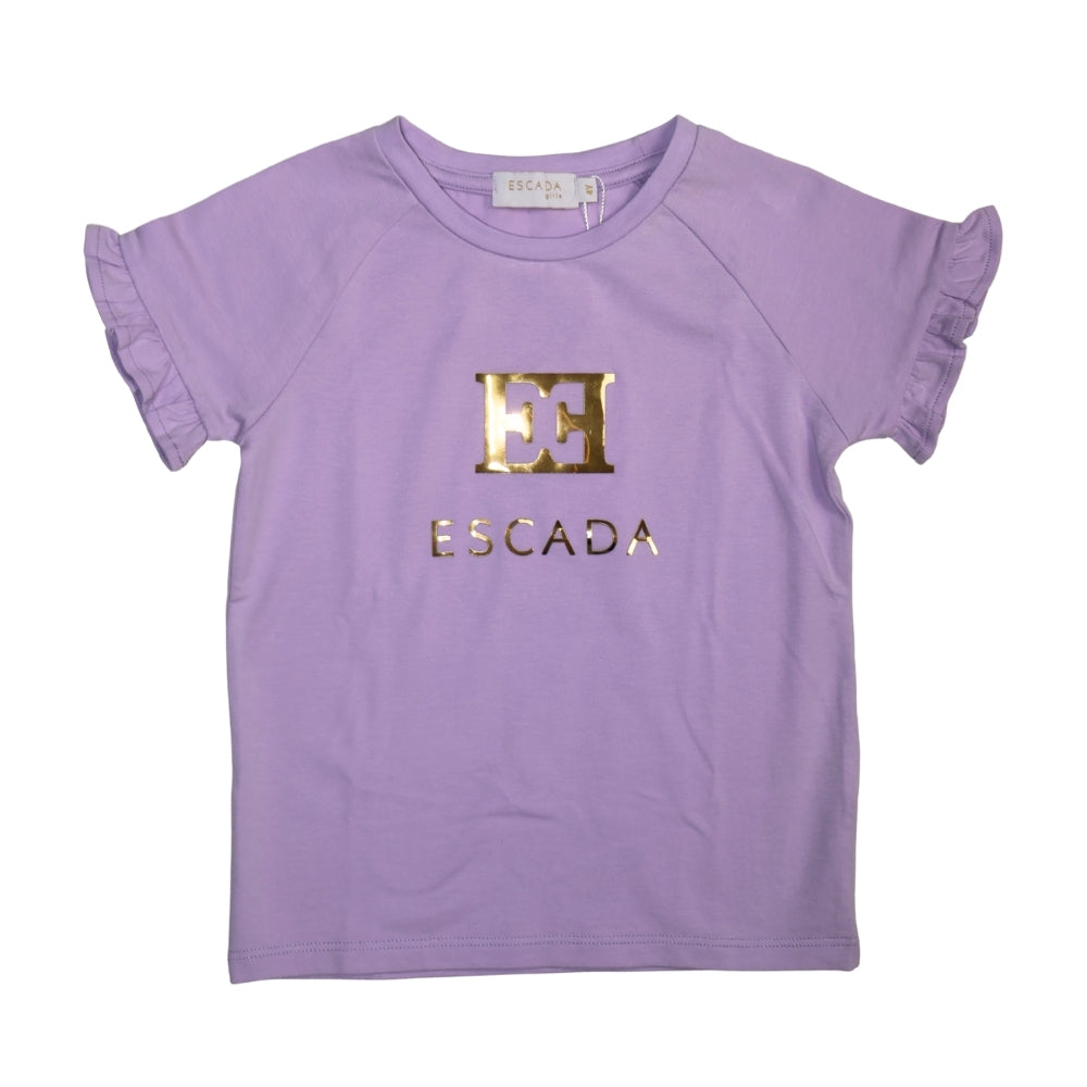 Playera de manga corta en color lila, confeccionada en algodón suave y ligero. Presenta un diseño femenino con detalle de holanes en las mangas y el logotipo Escada al frente en acabado dorado metálico. Una prenda versátil que combina estilo elegante y comodidad, ideal para un look casual con un toque sofisticado.