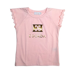 Playera de manga corta en tono rosa pastel, confeccionada en algodón suave para máxima comodidad. Destaca por su diseño femenino con holanes delicados en las mangas y el logotipo Escada en el frente con acabado metálico dorado. Una pieza elegante y versátil, perfecta para un look casual con un aire sofisticado