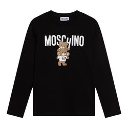 Playera de manga larga de Moschino, confeccionada en algodón suave y cómodo. Presenta un diseño en color negro con el logo de la marca en grande y los icónicos osos Teddy Toy estampados en el frente, aportando un estilo divertido y original. Corte clásico con cuello redondo, ideal para un look casual, juvenil y lleno de personalidad.