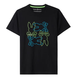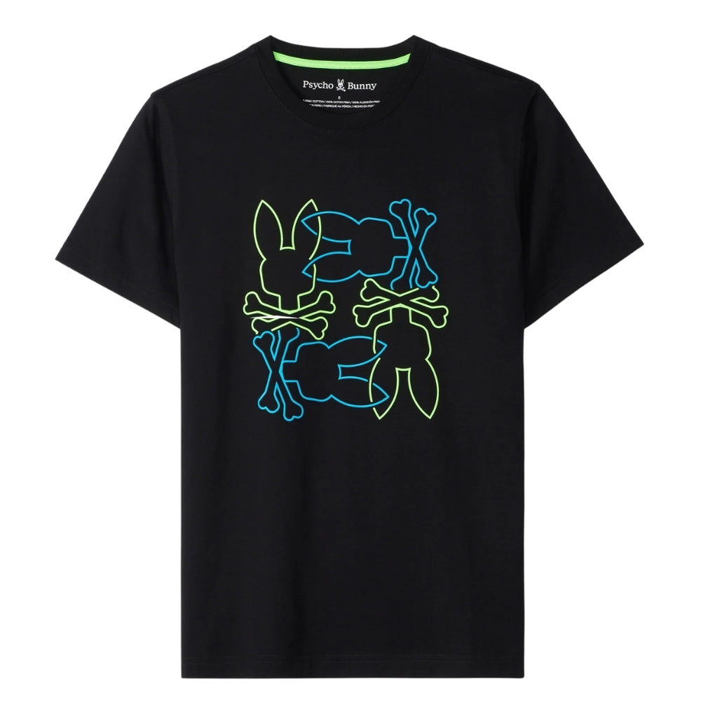 Playera de manga corta para niño, en color negro, con diseño frontal de cuatro logos de conejo y calavera en contorno verde y azul neón. Estilo moderno y juvenil, ideal para un look urbano y llamativo.