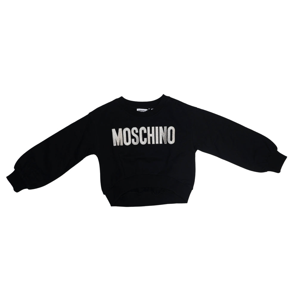 Sudadera para niña en color negro con diseño moderno y corte ligeramente corto. En la parte frontal destaca el logotipo MOSCHINO en relieve metálico plateado, aportando un toque llamativo y elegante. Con cuello redondo, manga larga y acabados acanalados en puños y cintura para un ajuste cómodo. Ideal para un look casual con un aire sofisticado al estilo Moschino.
