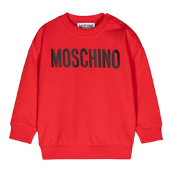 Sudadera para niña en color rojo vibrante, con diseño de cuello redondo y manga larga. Presenta el logotipo MOSCHINO en gran tamaño y color negro en la parte frontal, resaltando el estilo moderno y urbano de la marca italiana. Confeccionada en algodón suave y acabada con puños y dobladillo elásticos para un ajuste cómodo. Perfecta para combinar con looks casuales y dar un toque de moda distintivo