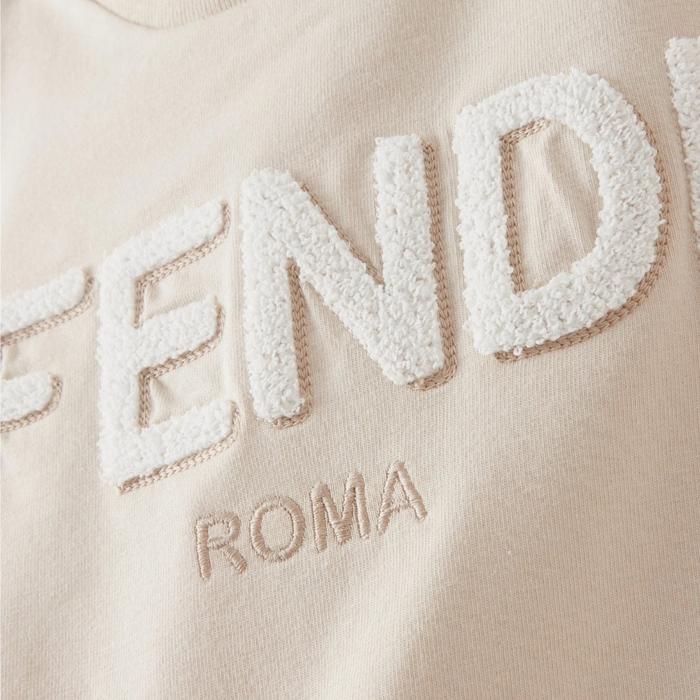 Camiseta beige con logotipo FENDI ROMA en relieve aterciopelado, aportando textura y estilo premium. Moderna, diferente y muy cómoda para el uso diario.