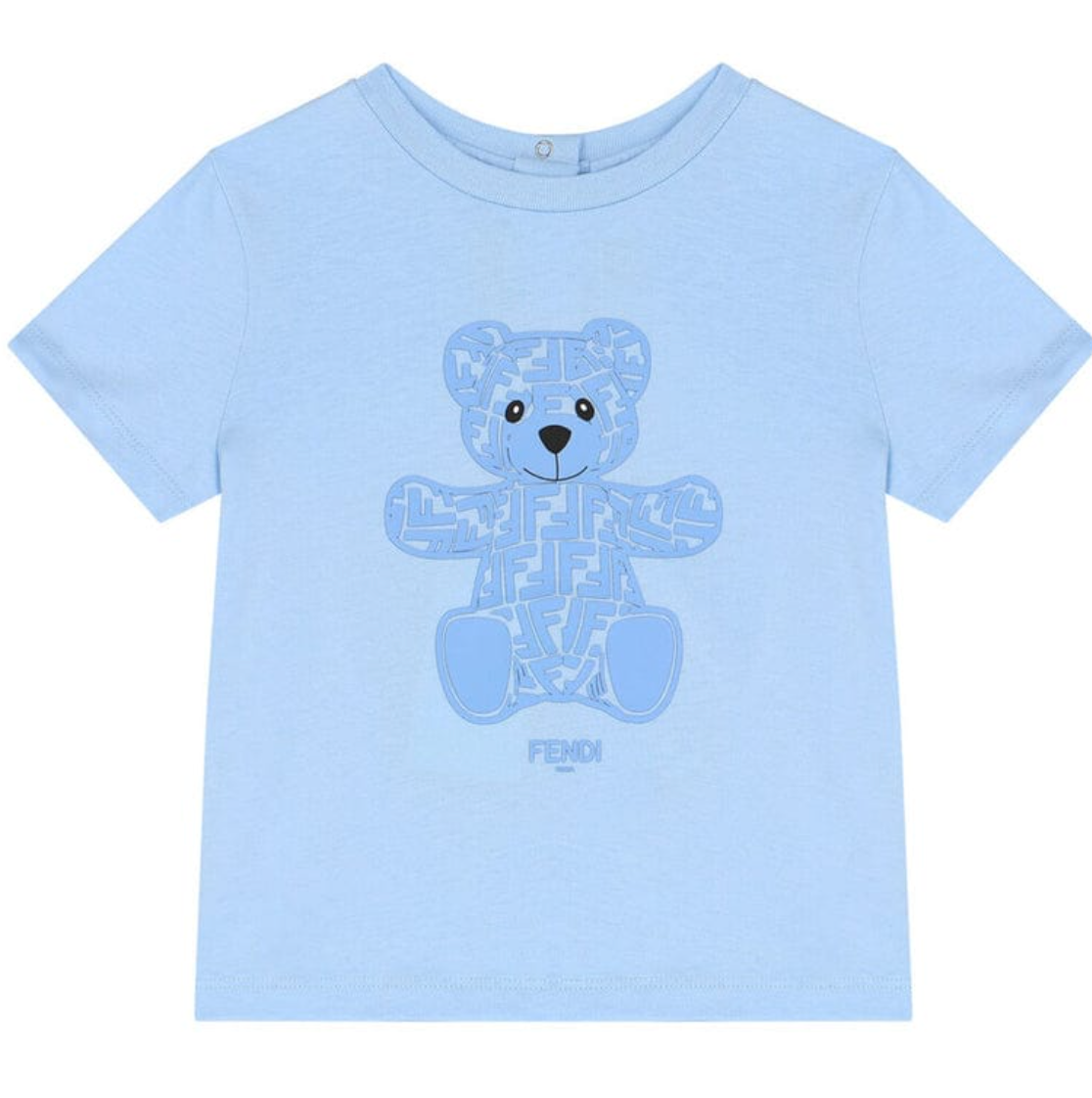 Playera en tono azul claro con estampado de oso en el frente, decorado con el clásico monograma FF de la marca. Una prenda divertida y moderna que combina el espíritu infantil con la elegancia característica de Fendi. Elaborada en algodón premium, ofrece suavidad y comodidad para el uso diario.