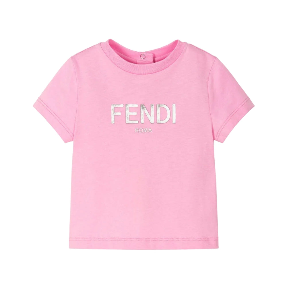 Playera en tono rosa fucsia con logotipo Fendi Roma en acabado plateado brillante al frente. Una pieza llamativa y moderna que aporta un toque de sofisticación infantil. Confeccionada en algodón suave, ideal para destacar en cualquier ocasión casual.