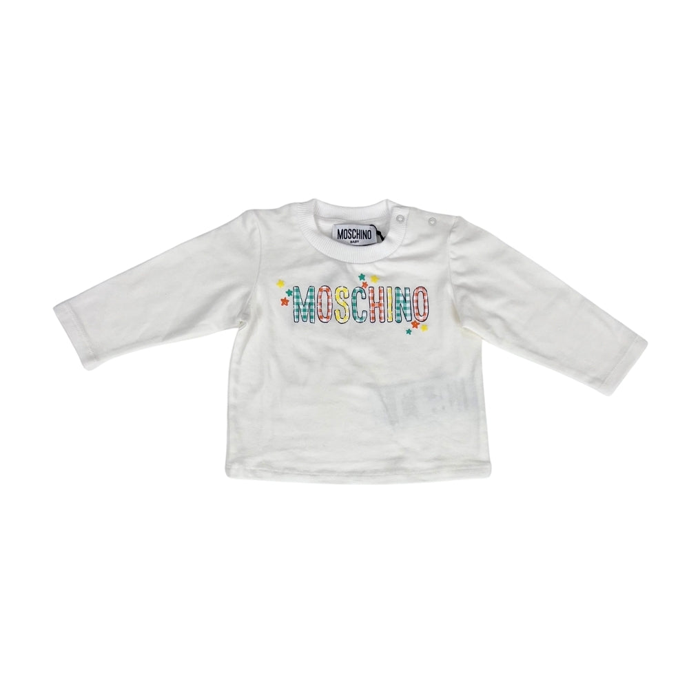 Un básico lleno de estilo: esta playera Moschino Baby de manga larga en color blanco está confeccionada en algodón suave para máxima comodidad. Su diseño resalta con el logotipo de la marca en tonos multicolor acompañado de estrellitas, aportando un aire alegre y moderno. Perfecta para combinar con jeans, leggins o conjuntos casuales, logrando un look fresco y con el sello inconfundible de Moschino.