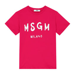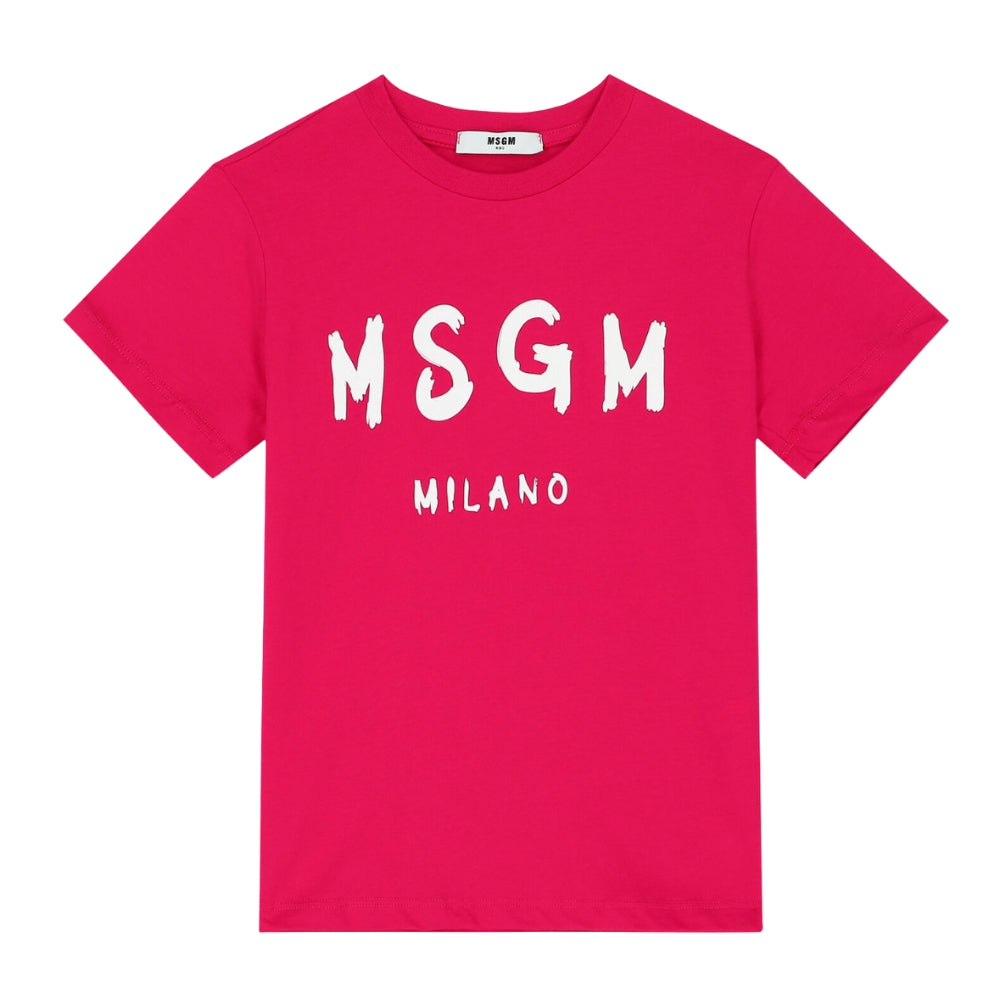 Playera en vibrante color fucsia con estampado frontal del logotipo MSGM Milano en letras blancas. Es una pieza llamativa que aporta energía y dinamismo al look de los pequeños. Su confección en algodón suave brinda confort y resistencia, ideal para actividades diarias.
