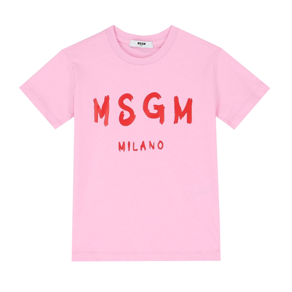 Playera rosa con logotipo MSGM Milano en rojo. Casual y moderna.