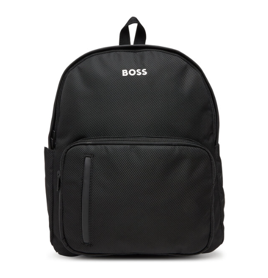 Mochila en color negro con textura ligera y diseño clásico. Tiene compartimento principal espacioso, bolsillo frontal con cierre y logo BOSS en blanco. Ideal para escuela, actividades o uso diario.