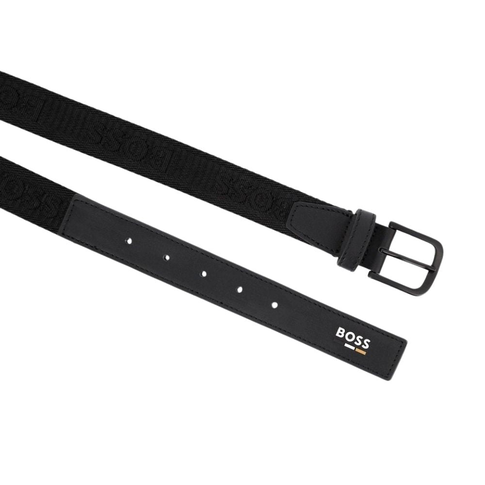 La máxima expresión del lujo contemporáneo. Este cinturón BOSS presenta un sofisticado diseño tonal en color negro, elaborado en un tejido de alta densidad con el logotipo de la firma sutilmente entretejido. Los remates en piel auténtica y su hebilla de pasador en metal negro mate refuerzan una estética minimalista y versátil. Es el accesorio clave para quienes buscan un estilo impecable que transite sin esfuerzo de un atuendo casual a uno de negocios.