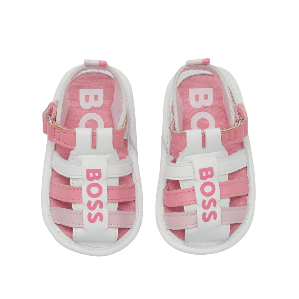 Sandalias para bebé de BOSS en combinación blanco con rosa, diseñadas para ofrecer frescura, comodidad y estilo en días cálidos. Con material suave y suela flexible, permiten libertad de movimiento sin irritar la piel delicada. Su cierre ajustable asegura un calce perfecto y fácil de poner y quitar. El diseño femenino y delicado es ideal para looks de verano o eventos especiales.