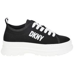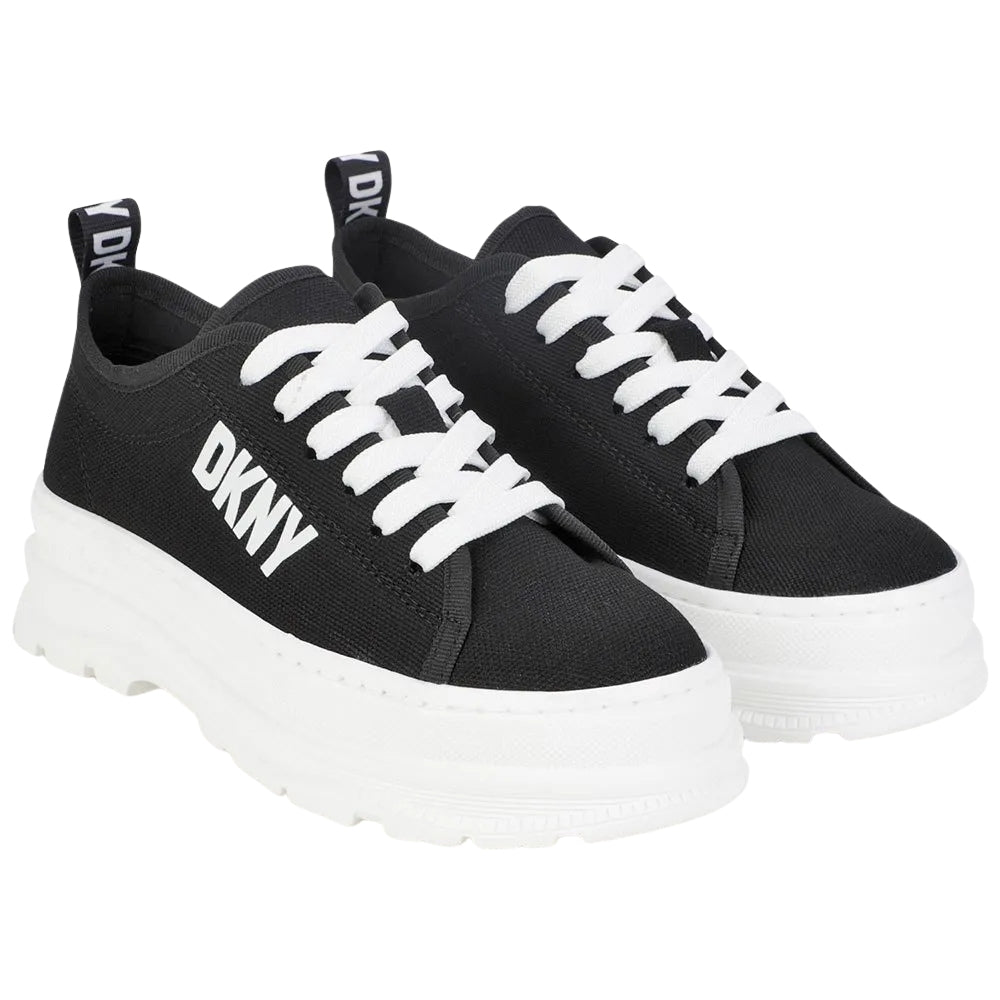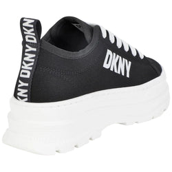 Zapatillas deportivas negras con suela blanca gruesa, cordones blancos y logo DKNY en el lateral.