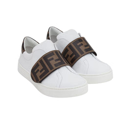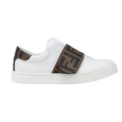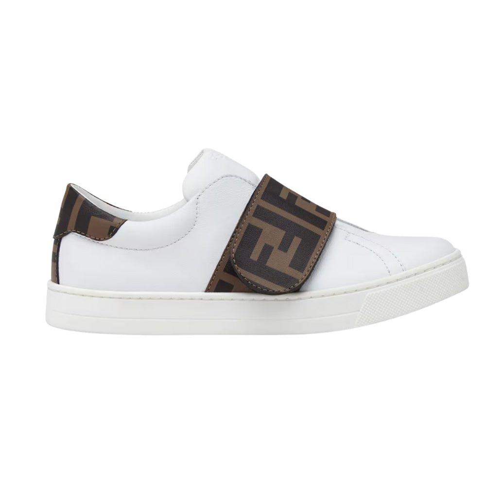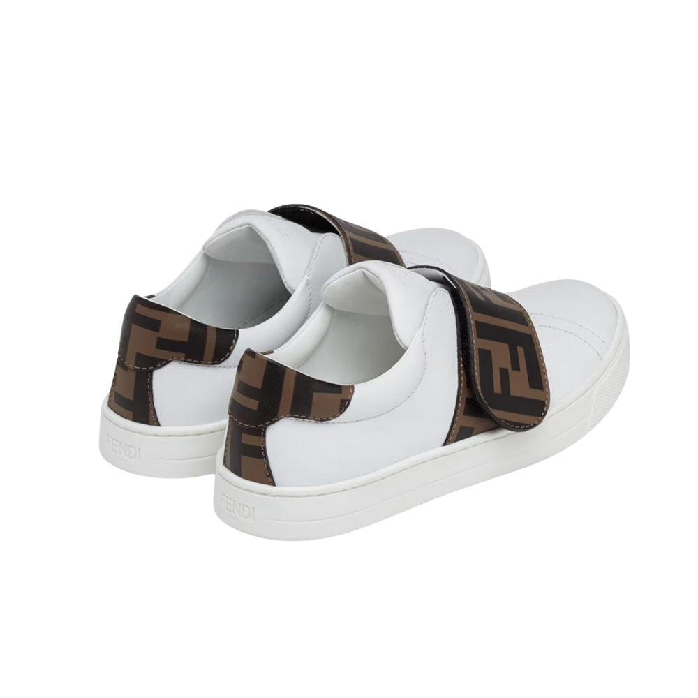 Tenis de piel en color blanco con diseño minimalista. Destacan por su correa ancha en la parte superior con el icónico logo FF de Fendi en tonos marrón y negro, aportando un estilo moderno y distintivo. Suela de goma blanca para mayor comodidad y durabilidad. Ideales para un look casual con un toque de lujo