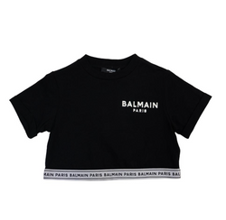 Camiseta corta negra de Balmain Paris, con logo en blanco en el pecho y franja elástica en la cintura con repetición de la marca. Moderna y cómoda, ideal para looks casuales.