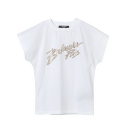 Camiseta blanca de Balmain Paris, con logo manuscrito adornado con cristales. Una pieza sofisticada y fresca, ideal para looks chic.