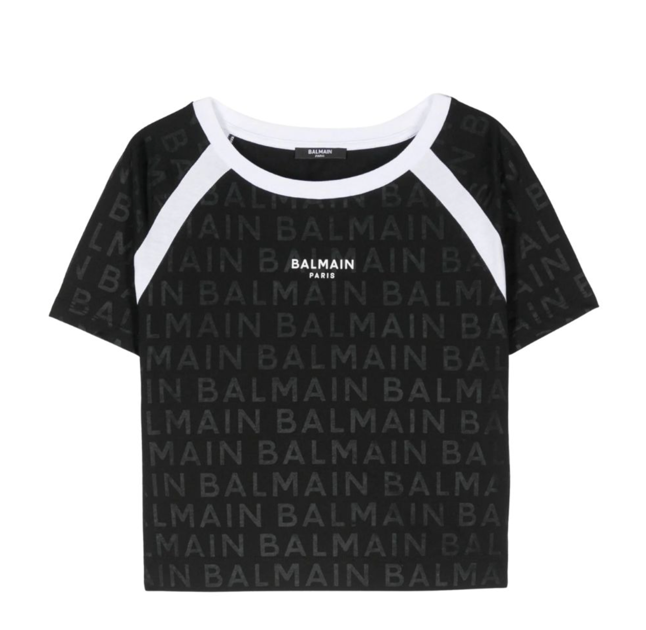 Camiseta negra de Balmain Paris con logo repetido en todo el tejido y detalles en blanco en cuello y hombros. Un diseño deportivo con aire de lujo.