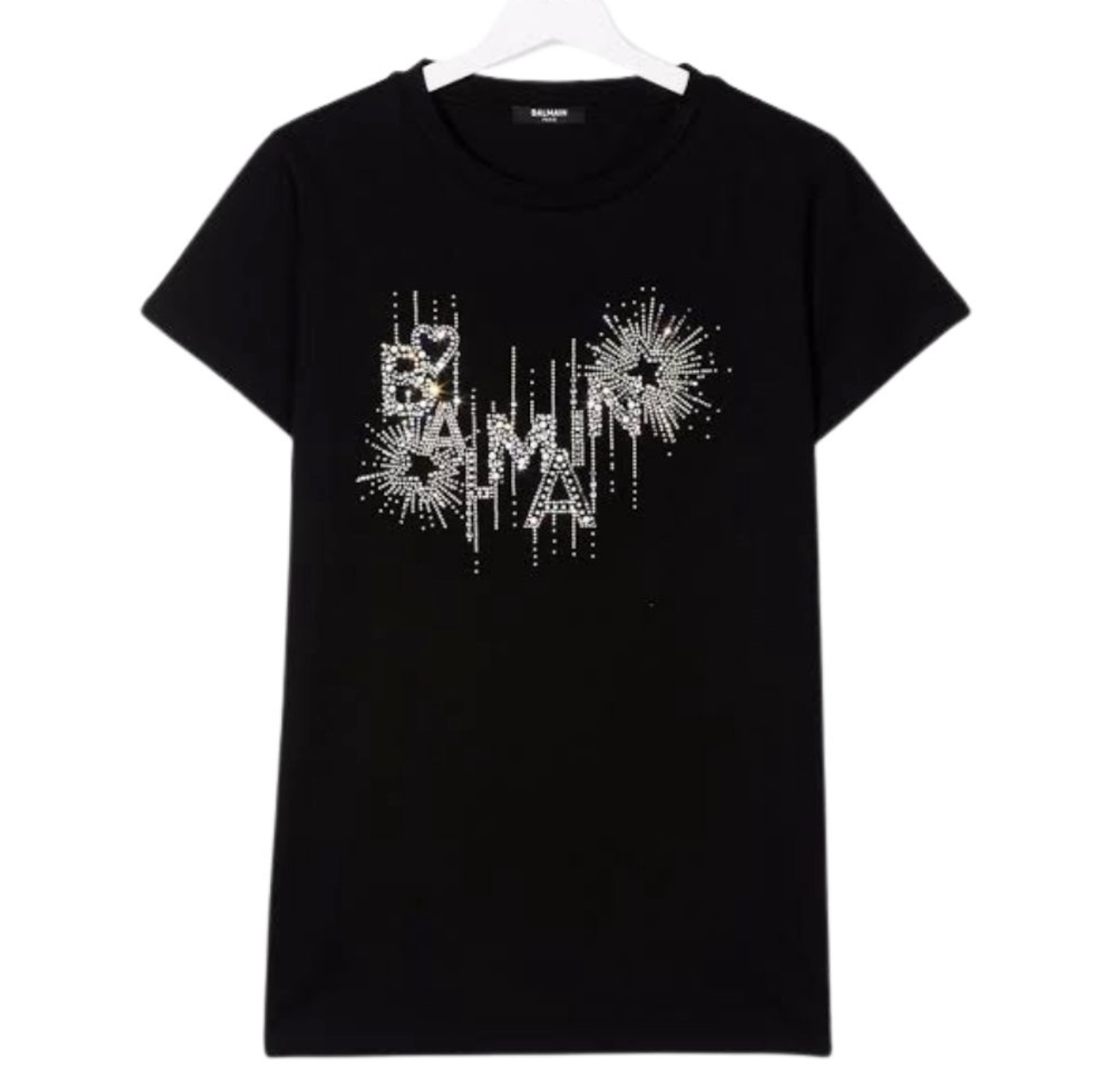Camiseta negra de Balmain Paris, con logo y gráficos en cristales que simulan destellos y fuegos artificiales. Una prenda llamativa y sofisticada con aire festivo.