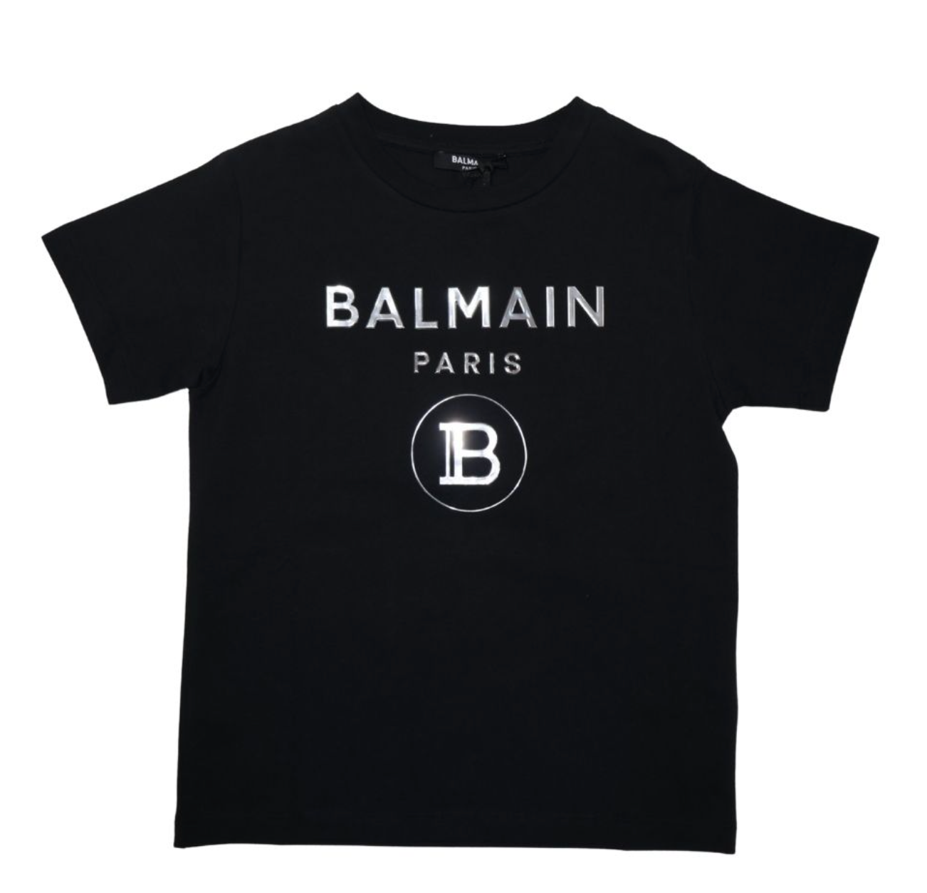 Camiseta negra de Balmain Paris, con logo frontal plateado y monograma circular. Un básico con estilo premium.