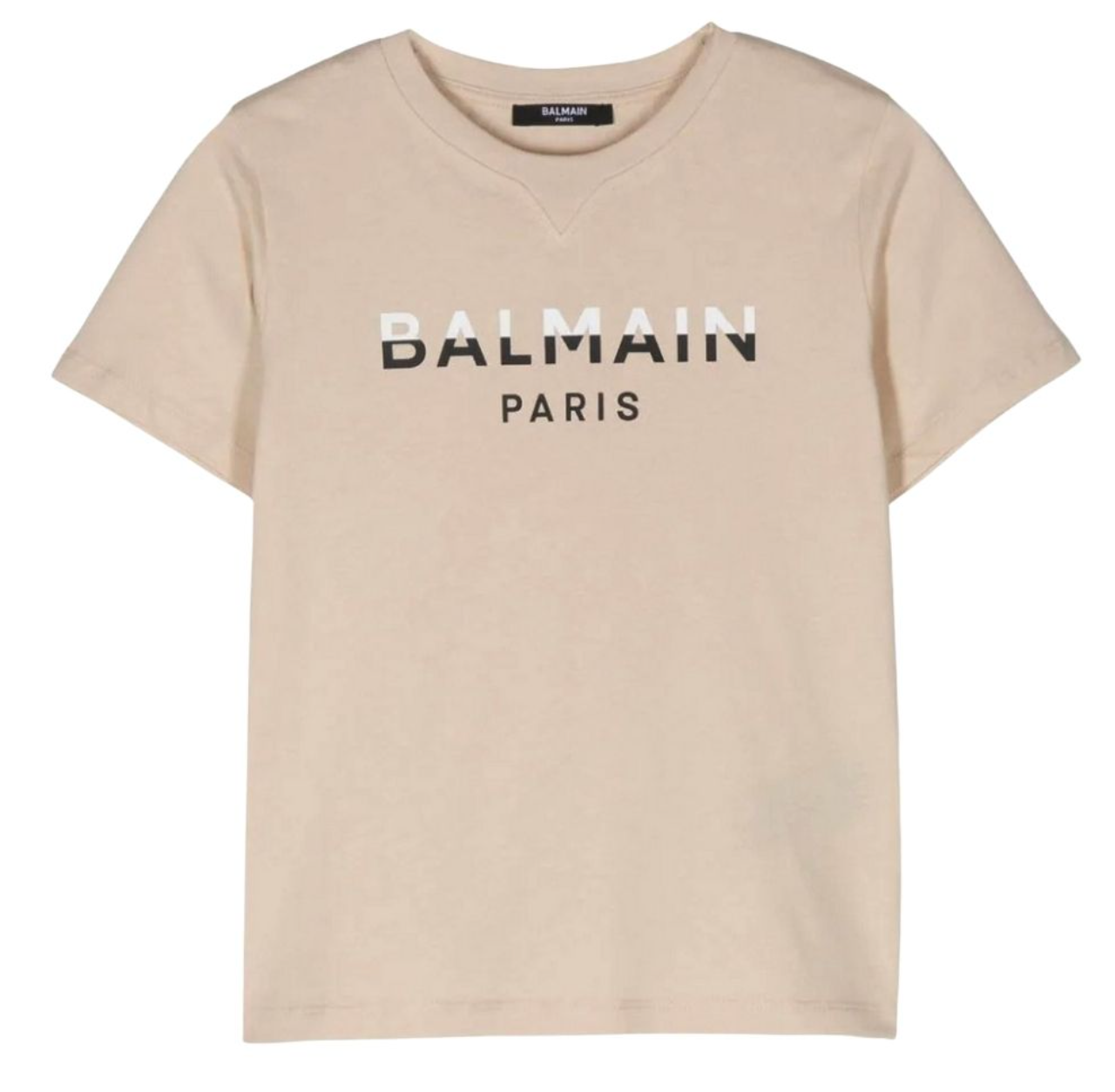 Camiseta beige de Balmain Paris, confeccionada en algodón premium, con logo negro en contraste. Estilo neutro y sofisticado para looks casuales con un aire elegante.