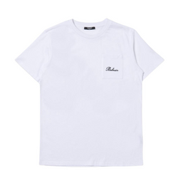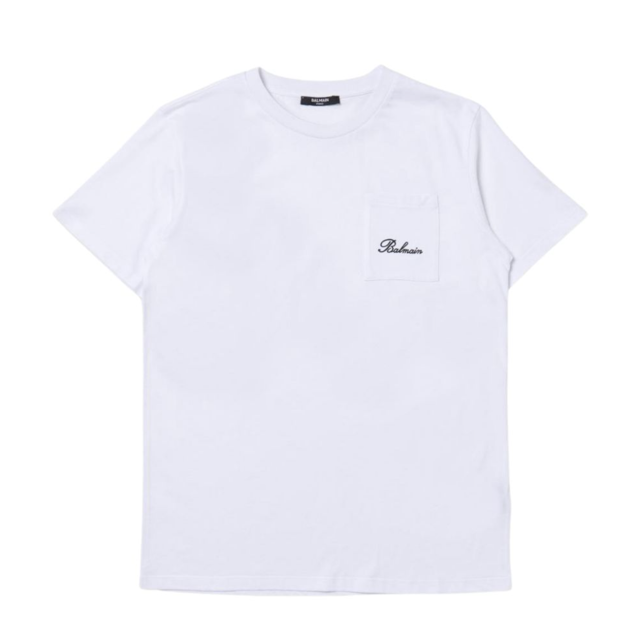 Camiseta blanca de Balmain Paris, con diseño minimalista y bolsillo en el pecho decorado con logo bordado en negro. Elegancia sencilla y versátil.