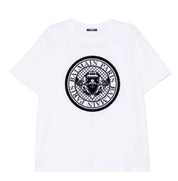 Camiseta blanca de Balmain Paris, con estampado central del escudo en negro y detalles gráficos alrededor. Una pieza que combina lujo y herencia.
