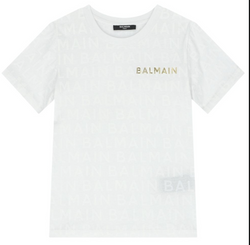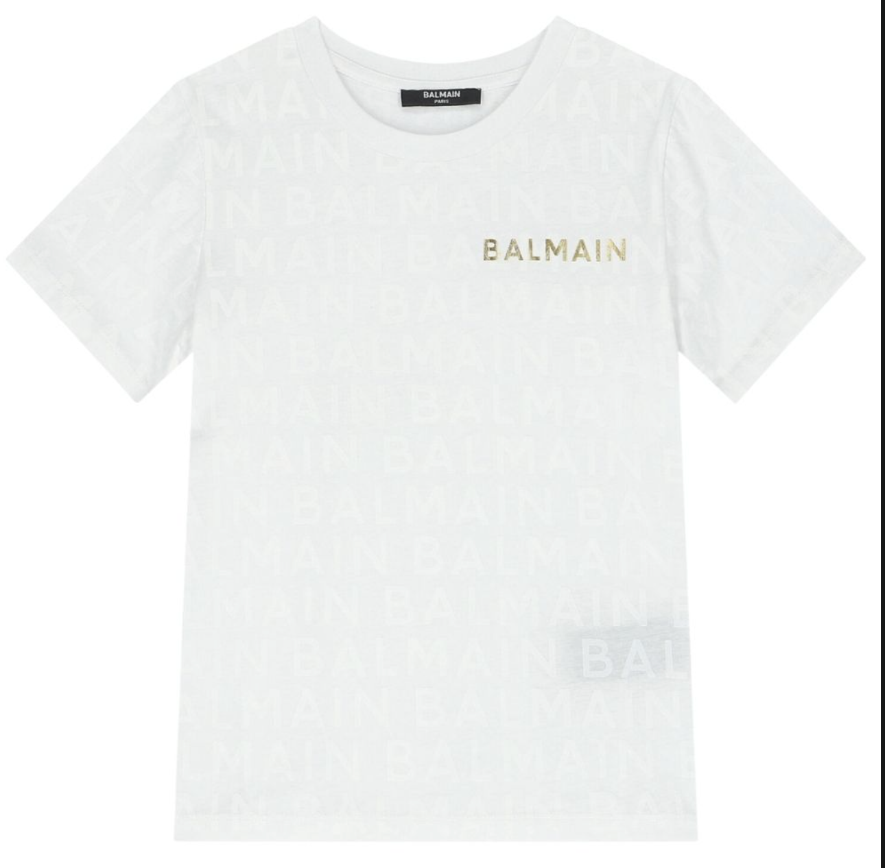 Camiseta blanca de Balmain Paris con estampado repetido en relieve y logo dorado en el pecho. Una prenda moderna y sofisticada.