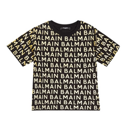 Camiseta negra de Balmain Paris con estampado repetido del logo en dorado por toda la prenda. Un diseño llamativo y sofisticado con aire de lujo urbano.