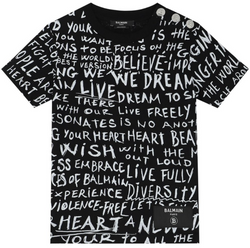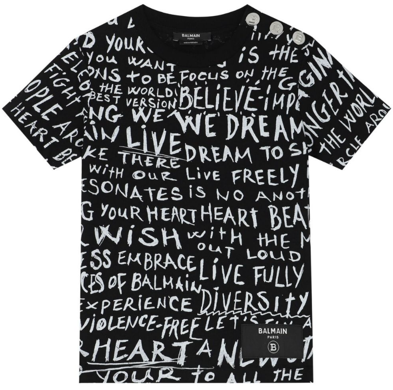 Camiseta negra de Balmain Paris con estampado integral en estilo graffiti blanco y botones metálicos en el hombro. Moderna y urbana, llena de actitud.