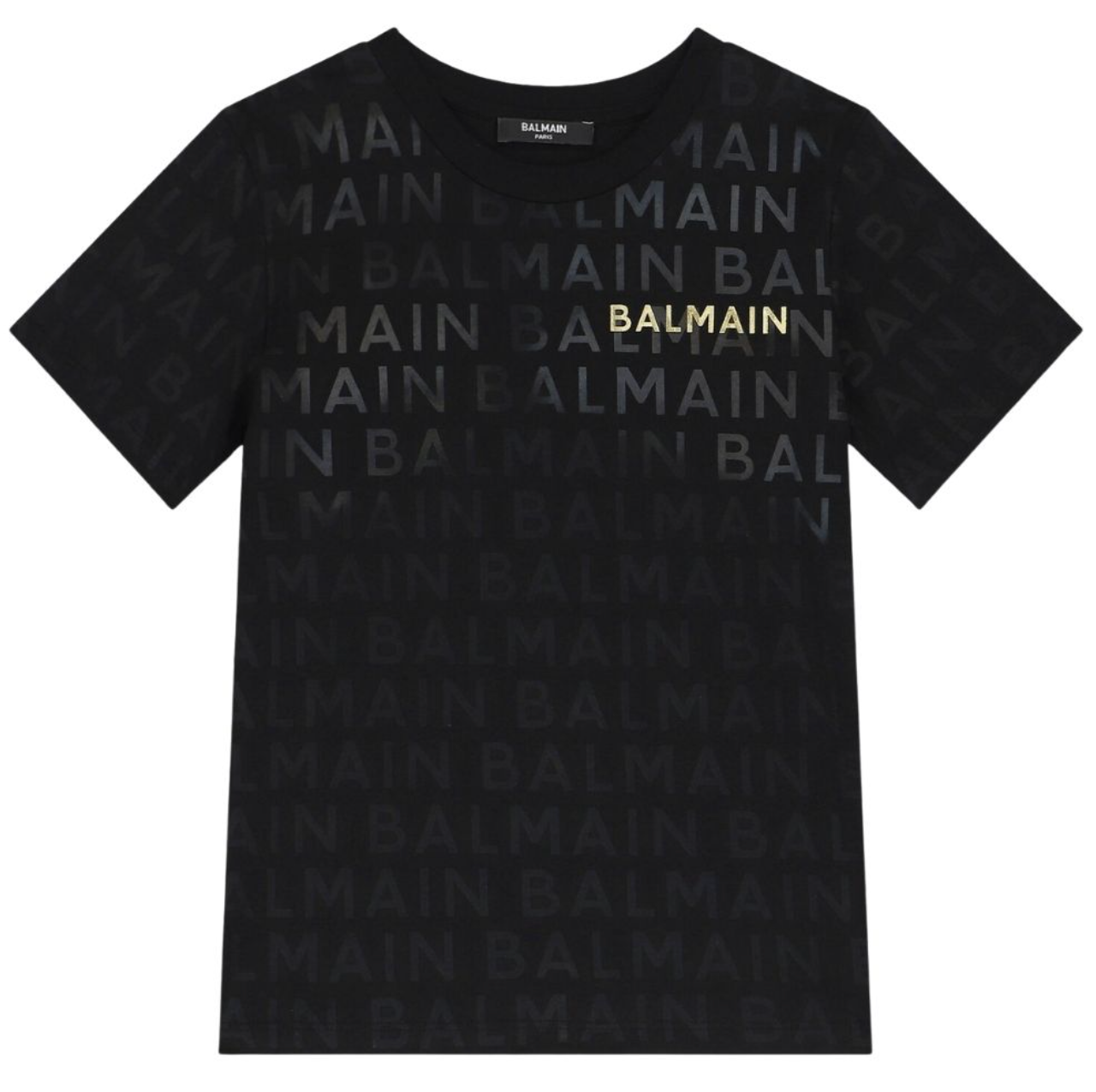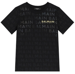 Camiseta negra de Balmain Paris con estampado integral tonal y logo dorado al frente. Sofisticación en un diseño con textura discreta.