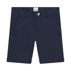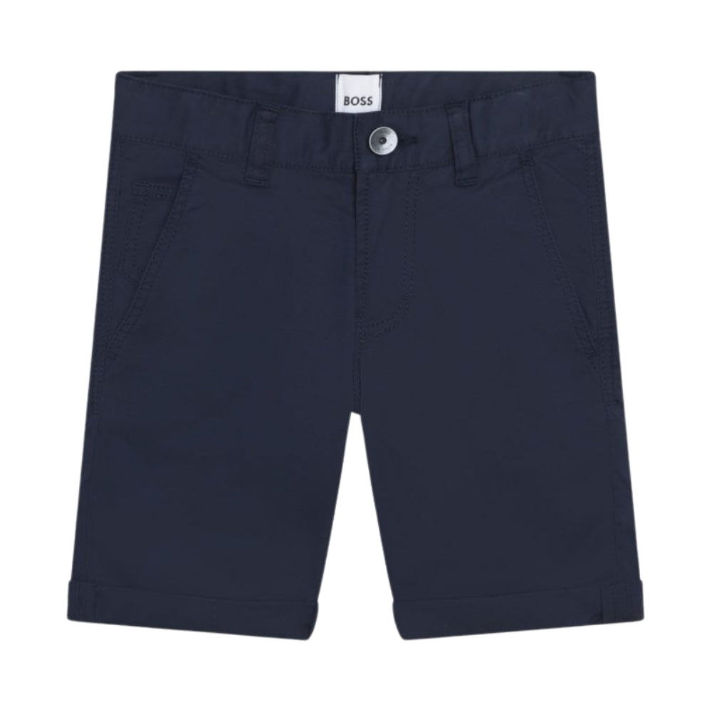 Short azul marino con dobladillo, pretina ajustable con botón y bolsillos, ideal para climas cálidos y uso casual.