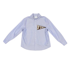 Camisa formal en tono azul claro tipo Oxford, con botones frontales y un detalle en parche marrón con las letras FENDI bordadas. Perfecta para un estilo elegante pero con sello de lujo italiano.