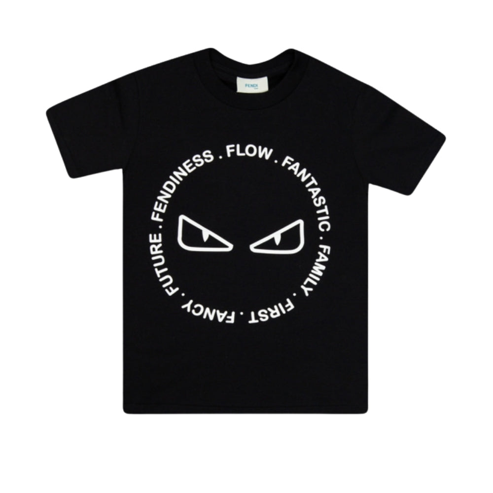 Camiseta en color negro con el mismo diseño gráfico circular de la versión amarilla, incorporando el logo y los icónicos ojos Fendi Monster. Una prenda urbana con carácter.