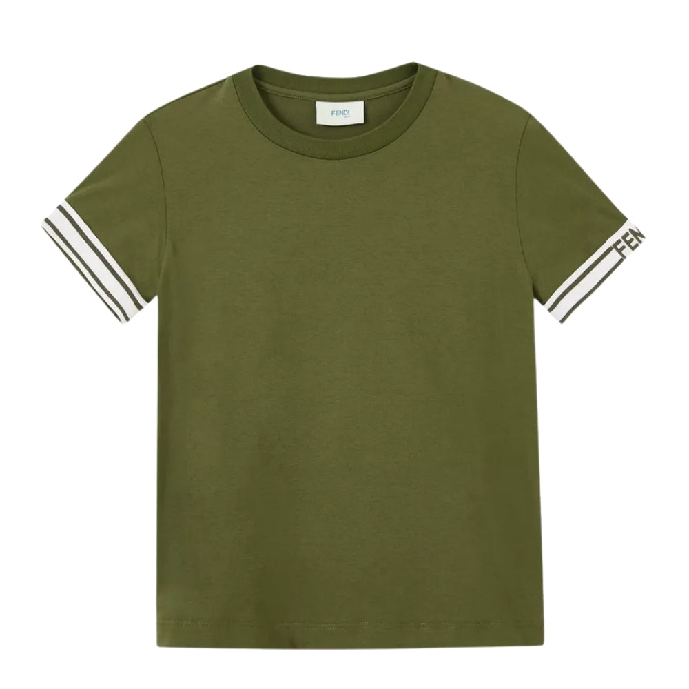 Camiseta en color verde militar con cuello redondo y franjas en contraste blanco y negro en las mangas, donde destaca el nombre Fendi. Diseño casual y juvenil, ideal para un look urbano relajado.