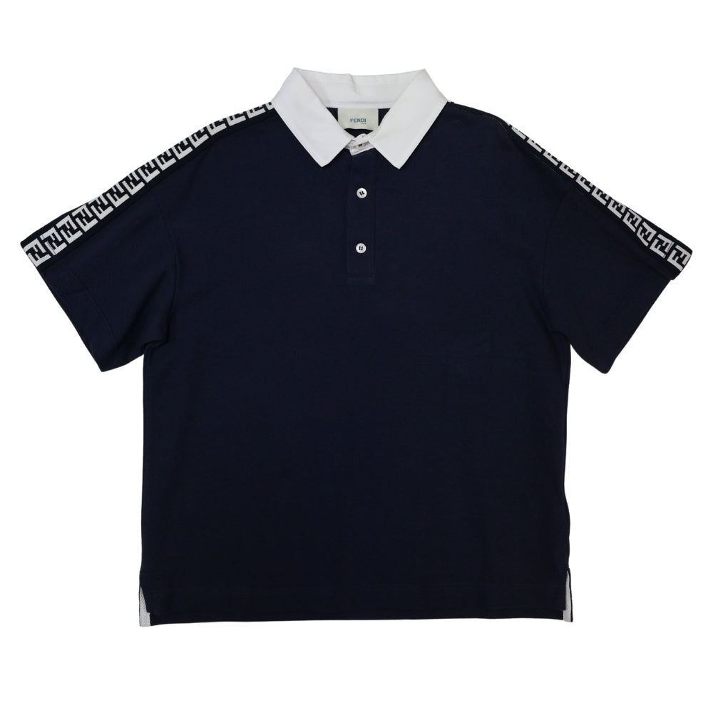 Polo en azul marino con cuello en contraste blanco y detalle logomanía Fendi en ambas mangas. Confeccionado en algodón piqué, es una prenda sofisticada que mezcla lo clásico con un toque contemporáneo distintivo de la marca.
