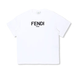 Playera blanca de algodón con el logo Fendi Roma estampado en negro al frente. Diseño limpio y versátil, perfecto para un look minimalista con toque de lujo.