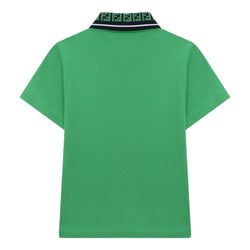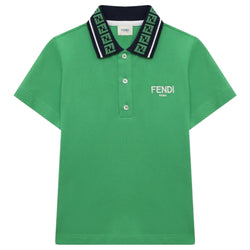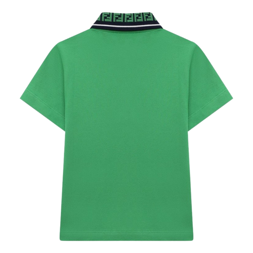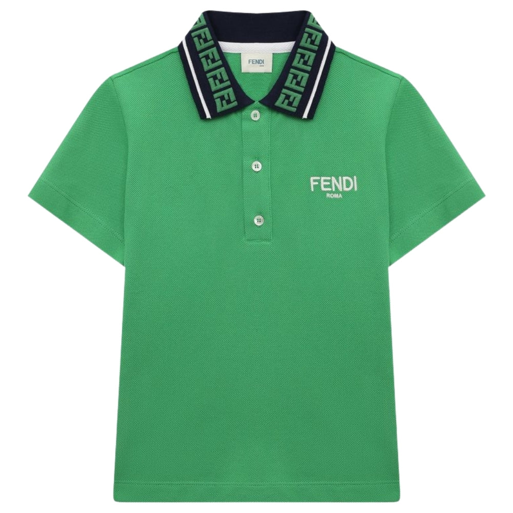 Polo verde de algodón piqué con cuello en contraste azul marino y detalles logomanía Fendi en las solapas. Logo bordado en el pecho, diseño moderno y llamativo para destacar.