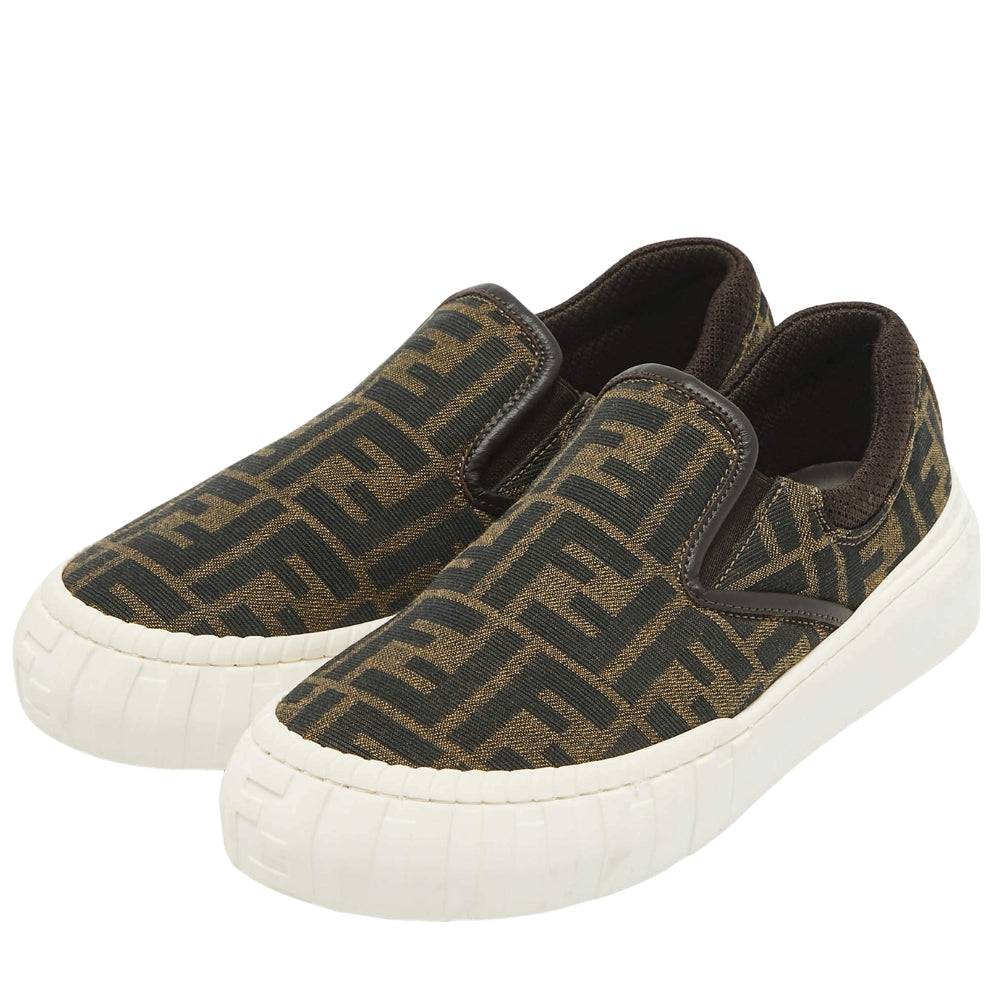 Zapatillas slip-on Fendi para niña y niño confeccionadas en lona marrón con el clásico motivo FF en negro. Diseño sin cordones con elásticos laterales para un mejor ajuste y comodidad. Detalle de ribete en piel marrón oscuro. Suela de goma blanca con puntera reforzada y logo Fendi grabado en relieve. Interior con forro suave para mayor confort.