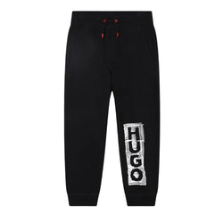 Pantalón jogger HUGO Boss en color negro, confeccionado en algodón suave y cómodo. Presenta cintura elástica con cordón ajustable en rojo y el distintivo logo HUGO estampado en diseño artístico blanco en la pierna. Su estilo moderno y relajado lo convierte en una prenda ideal para looks urbanos o deportivos con un toque sofisticado.