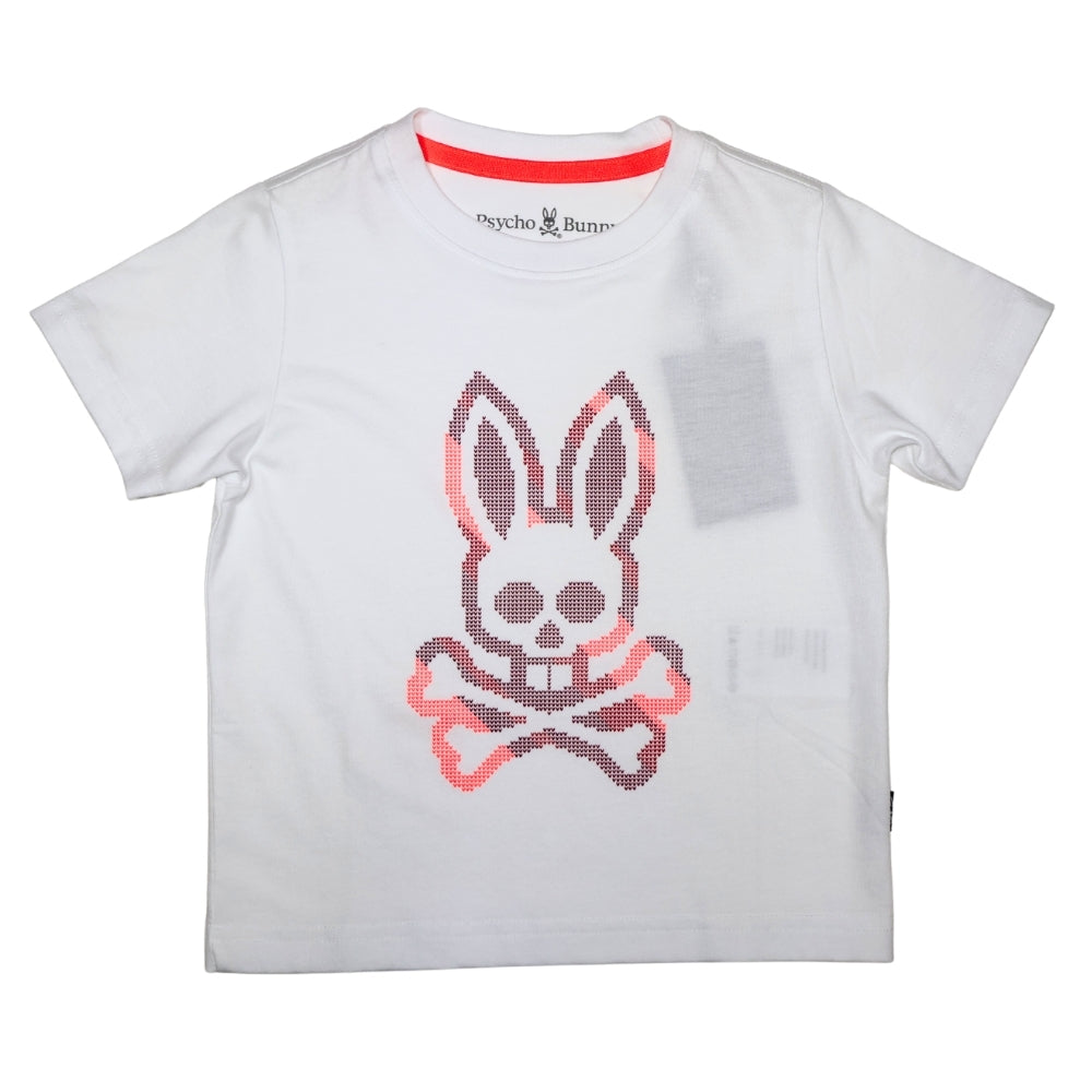 Playera de manga corta para niño, en color blanco, con el logo clásico de conejo y calavera en diseño pixelado en tonos rosa y gris. Estilo moderno, ideal para un look casual y divertido.
