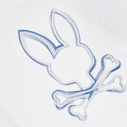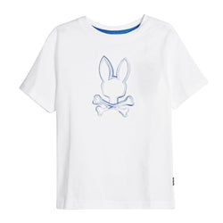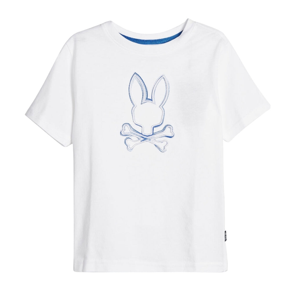 Playera de manga corta para niño, en color blanco, con el logo icónico de conejo y calavera en bordado azul degradado. Diseño limpio y moderno, ideal para un look casual y fresco.