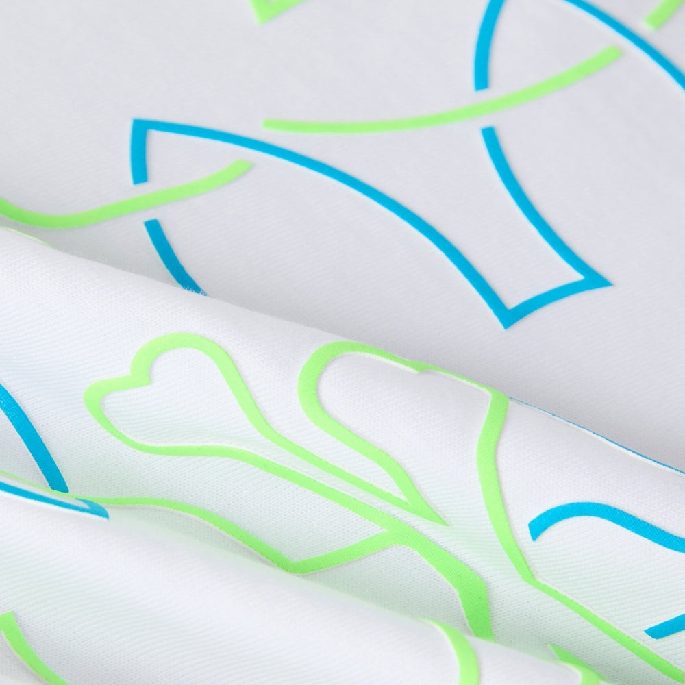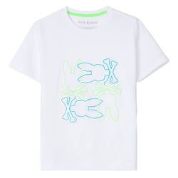 Playera de manga corta para niño, en color blanco, con diseño frontal de cuatro logos de conejo y calavera en contorno azul y verde neón. Estilo fresco y moderno, ideal para un look casual juvenil.