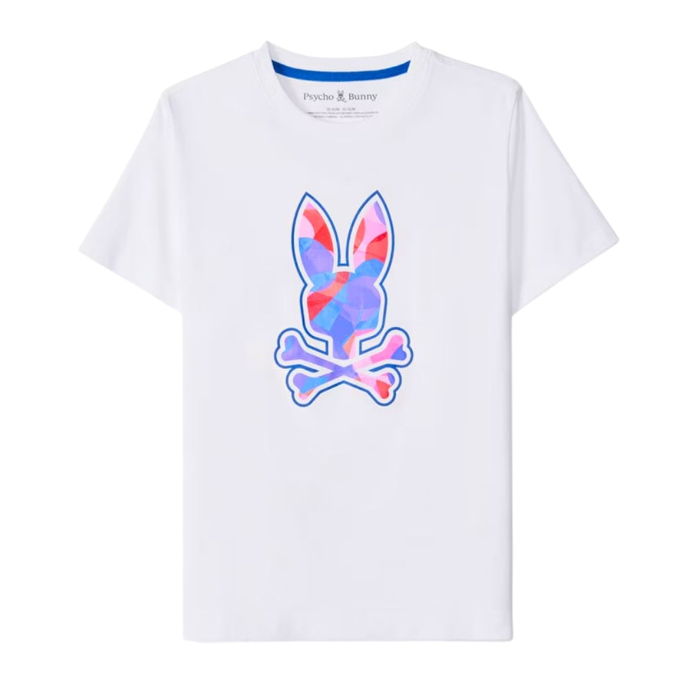 Camiseta de manga corta confeccionada en algodón suave, color blanco con estampado frontal del icónico logo de conejo y huesos en diseño multicolor geométrico. Ideal para un look moderno y casual con el estilo distintivo de Psycho Bunny.