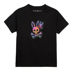 Playera de manga corta para niño, en color negro, con el logo distintivo de conejo y calavera en tonos vibrantes multicolor al frente. Confección cómoda y diseño moderno, ideal para uso casual.