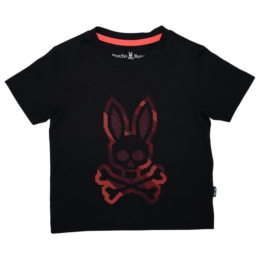 Playera de manga corta para niño, en color negro, con logo icónico de conejo y calavera en estilo pixelado en tonos rojos. Diseño juvenil y moderno, ideal para un look casual con personalidad.